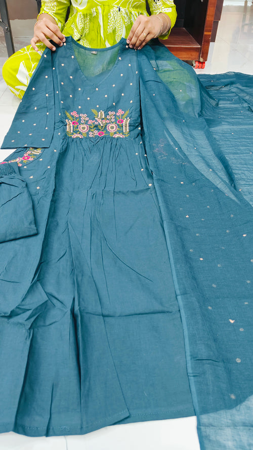 Blue Kurta Set designed for everyday comfort and effortless elegance. This stylish set includes 1 kurta and 1 pant, offering a comfortable and flattering fit. The kurta features a V-neck with embroidery detailing, adding a refined touch, and is paired with 3/4th sleeves for a graceful and versatile look—perfect for daily wear, office use, or casual outings.